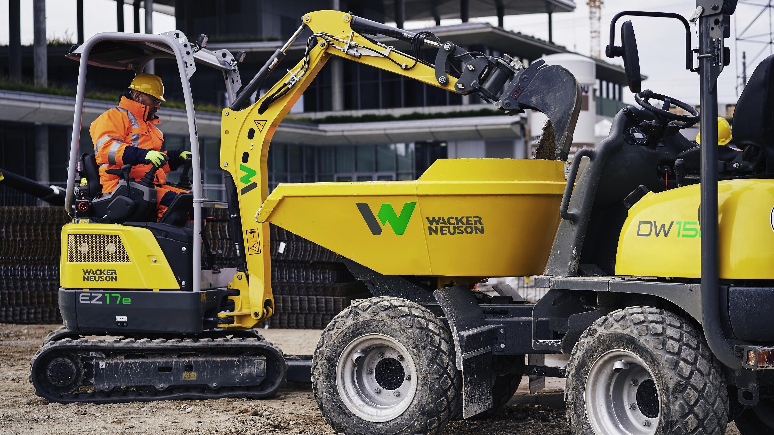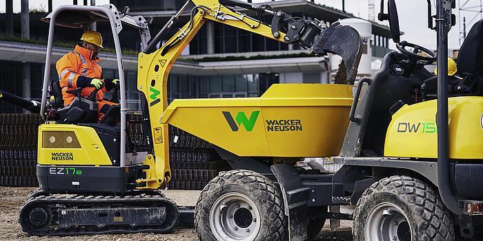 In this construction project, outdoor facilities, children’s playgrounds, benches, sidewalks, and loading zones are being created, among others. For this, cables were laid, green areas were created, paths prepared and concrete foundations set. The battery-powered mini-excavator EZ17e found application in the ensuing excavation work. High-quality lithium ion technology has already been used by Wacker Neuson for several years, for with it, the machine meets the high requirements for performance duration, durability, safety and sturdiness. The generous battery capacity ensures that the hydraulic functions, with the same performance as on a conventional model, are available the whole workday long. The excavated material is transported by means of the electric dumper DW15e.